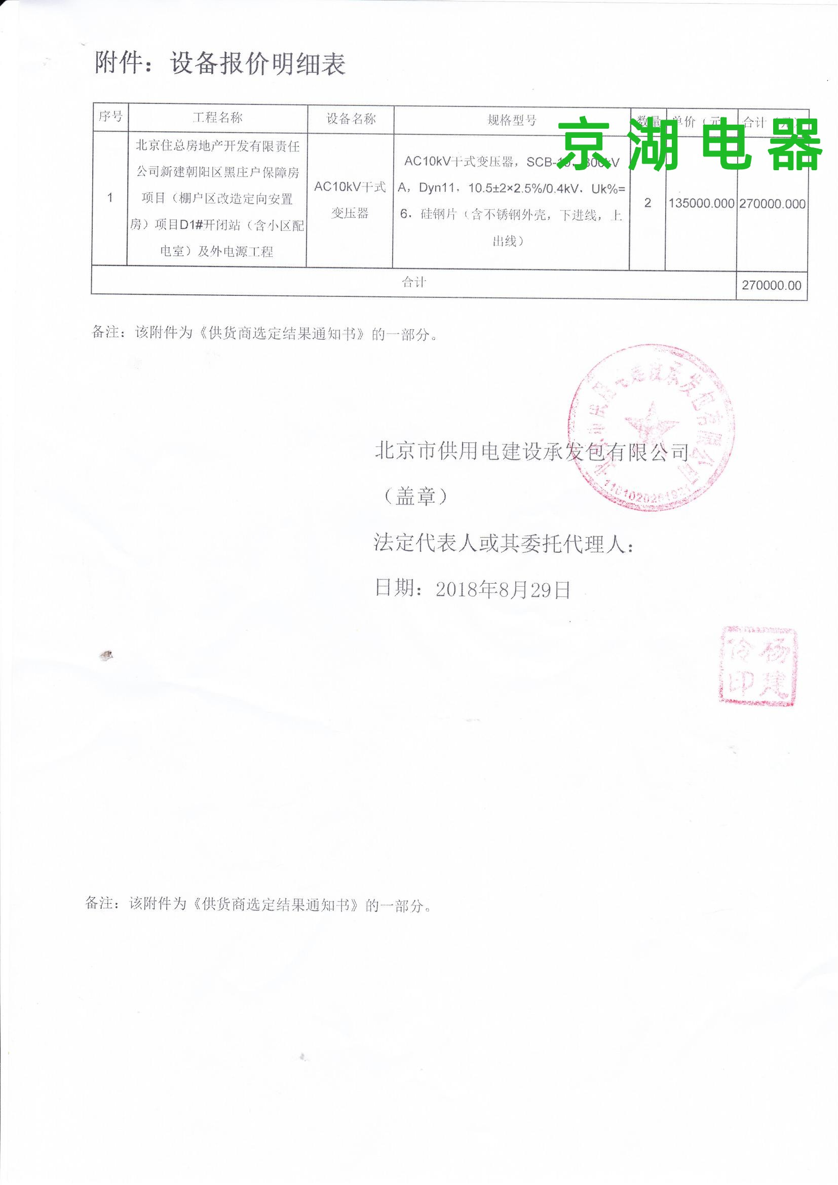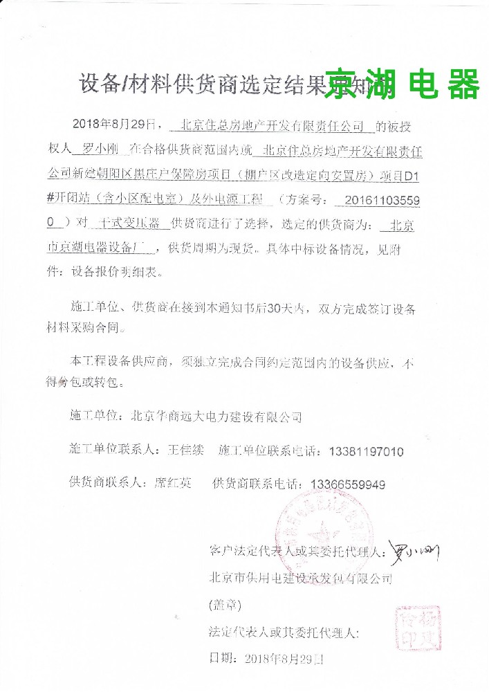 北京住總房地產(chǎn)開發(fā)有限責(zé)任公司 供貨商選定結(jié)果通知書