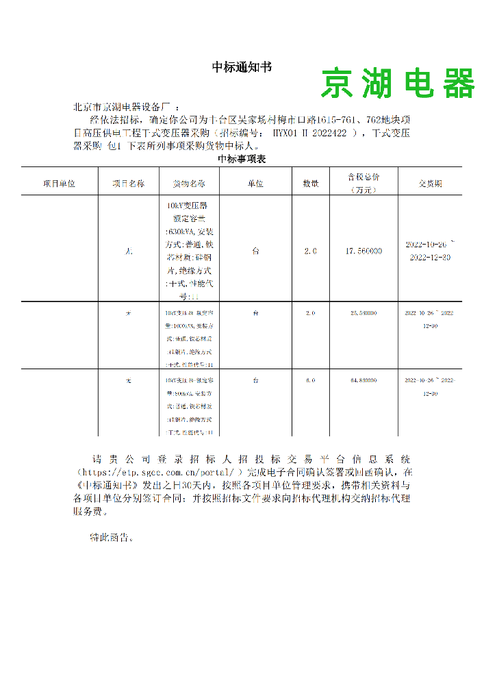 北京豐供送變電工程有限公司 中標(biāo)通知書(shū)