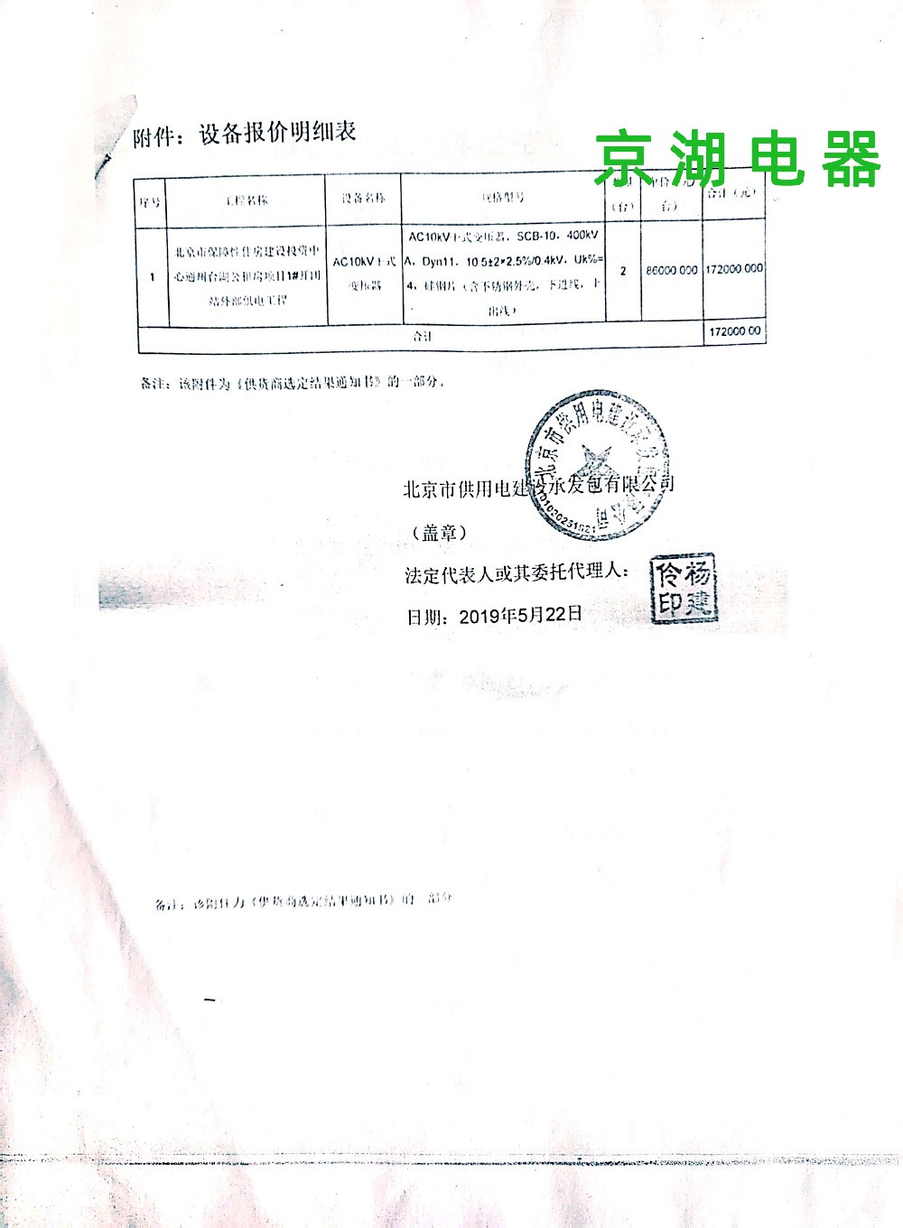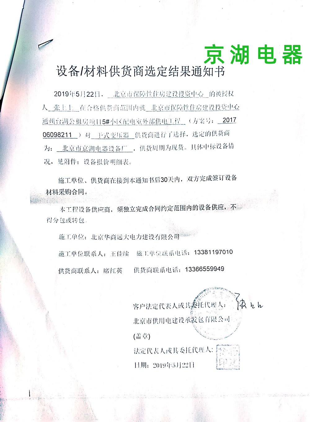 北京市保障性住房建設(shè)投資中心 供貨商選定結(jié)果通知書 2019年5月22日