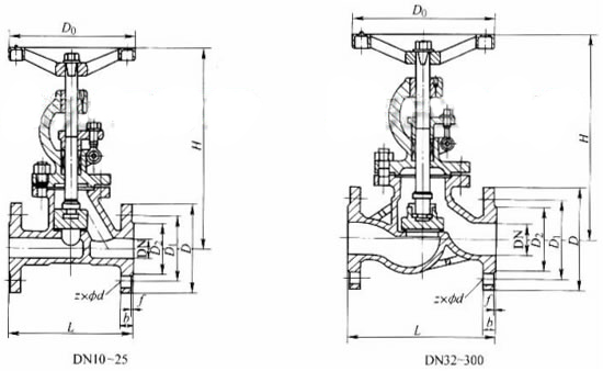 J41N 型 PN40 鋼制截止閥外形及結構尺寸 (mm)