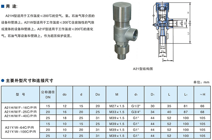 A21F.A21H彈簧微啟式外螺紋安全閥適用于工作溫度≤200℃的空氣、氨、石油氣……等介質(zhì)的設(shè)備或管路上。A21W-P、R型適用于溫度≤200℃有腐蝕性的氣體或液體的設(shè)備或管路上,作為超壓保護(hù)裝置。KA21Y型適用于溫度≤100℃的液化石油氣等。